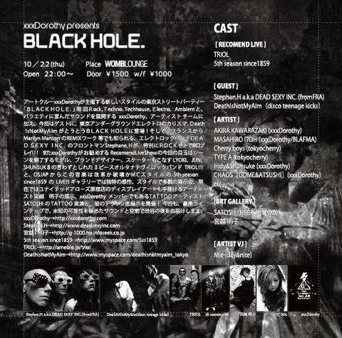 xxxDorothy presents BLACK HOLE date:10/22日(thu)22:00~ place:WOMB LOUNGE Door:1500(1d) W/F:1000(1d) CAST 【RecomendLIVE】 TRIOL, 5th season since1859 【GUEST DJ】 Stephan.H a.k.a DEAD SEXY INC.(fromFRA), DeathIsNotMyAim(disco teenage kicks) 【ARTIST DJ】 AKIRA KAWARAZAKI(xxxDorothy) ,MASAHIRO ITOH(xxxDorothy/BLAFMA) ,Cherry boys(tokyocherry) ,TYPE A(tokyocherry) ,Hidy&Shunsuke(xxxDorothy) ,CHAOS[GOME&ATSUSHI](xxxDorothy) 【ART gallery】 SATOSHI(RYU'sTATTOO) 宮越 明子