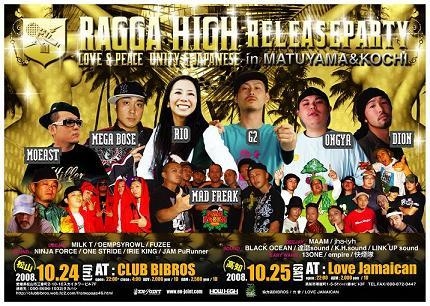 10月24日(金) RAGGA HIGHリリースツアー松山@BIBROS PM10:00〜AM4:00 ADM2000 1ドリンク DOOR 2500 1ドリンク 【GUEST】 G2(岐阜) ONGYA(大阪) DION(大阪) MOEAST(東京) RIO(東京) MEGA BOSE(愛媛) 【GUEST SOUND】 MAD FREAK(東京) 【SOUND】 NINJA FORCE/ONE STRIDE/IRIE KING/JAM PuRunner 【Dee Jay】 MILK-T/DEMPSY ROWL/FUZEE お問い合わせ 090−8696-1932(高橋 10月25日(土) RAGGA HIGHリリースツアー高知@LOVE JAMAICAN PM10:00〜 ADM2000 1ドリ