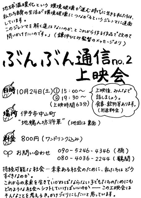 お近くの方も、そうでない方も、ぜひぜひ遊びにきてください! ※転送・転載大歓迎! 【ぶんぶん通信no2上映会】 日時:2009年10月24日(土)第1部 15:00START 第2部 19:30START 料金:\800(1ドリンク付) 場所:地鶏ん坊将軍(伊予市中山町 ※56号沿いの大きな観音像のあるところ) ※無料にて宿泊可能です(寝袋ご持参ください。) お問い合わせ先:第1部080-4036-2244(鶴間)/第2部090-5246-4346(楠) 上映時間は63分。 上映後みんなで美味しい地鶏やお酒を頂きながら、