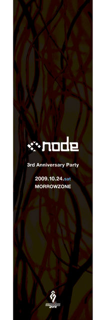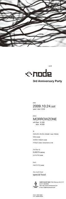 【node】 3rd Anniversary Party 2009.10.24.sat open / start 23:00 with flyer \1,500 door \2,000 dj daisuke akutsu [PHASE / node / PROVO] taka [node] wataru kajiya [node] mitayo [node / monochrome / E-R] 2nd floor dj KUBOTA[NERVE] yunuma[node] food: naomi ito[node] this month food: special food