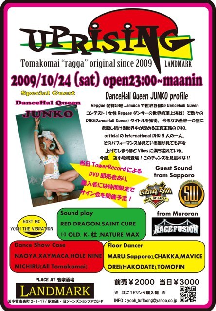 告知失礼します。 完全に冬まっしぐらな感じの苫小牧ですが、めちゃくちゃ熱いイベントのお知らせです。 なんと、世界一の女性REGGAEダンサー【DHQ JUNKO】が苫小牧LANDMARKに登場します!!! 小箱なので、間近で見ることが出来ますよ!!! そのVIBESはハンパないです。 一見の価値はありすぎます。 是非ご近所のお友達、恋人、お父さん、お母さんお誘い合わせの上お越し下さい。w 入場制限の可能性もありますので、その際は前売の方を優先して入場とさせて頂きます。 以下、詳細↓ 【UPRISING】 2009/10/24 23:0