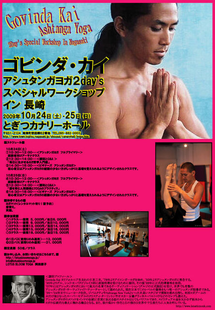 こんばんは。 いつも、大変お世話になっている長崎のヨガ スタジオの岡西さんのWSのお知らせです。 Govinda Kai ASHTANGA YOGA 2Dayスペシャルワークショップ in Nagasaki 日時 2009年10月24日(土) ?10:30〜12:00・・・<アシュタンガヨガ フルプライマリー> 経験者向けアーサナクラス ?12:30〜14:00・・・<講話とQ&A> 毎日に生かせるヨガ哲学入門編」 ?14:30〜16:00・・・<ビギナーズ アシュタンガヨガ> 初心者又はアシュタンガヨガの経験の少ない方がしっかりと基礎を覚えられるようにデザインされたク