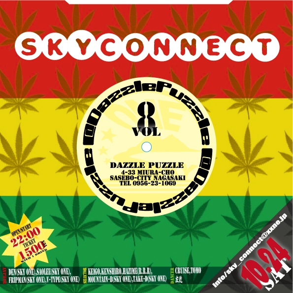 実は2、3日前から背中が痛みます。 しかし! 『オヤジの栄光時代はいつだよ・・・・全日本のときか?』 『オレは・・・・・・・・ ・・・・・・・オレは今なんだよ!!』 っつーことで SKY CONNECT vol.8 10/24(Sat) TICKET 1500yen(W/1D) START 22:00〜 @DAZZLE PUZZLE 【SELECTOR】 KEIGO KENSHIRO TAKE-D(SKY ONE) MOUNTAIN-B(SKY ONE) 【DANCER】 CRUISE TOMO 左近 【LIVE】 SAOLEE(SKY ONE) FRIPMAN(SKY ONE) ν-TYPE(SKY ONE) DEN(SKY ONE) 気我 マイ