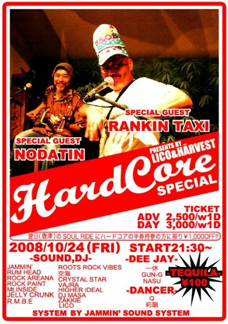 =SPECIAL GUEST= RANKIN TAXI(東京) ―GUEST DEEJAY― 一休 NASU(福岡) GUN-G(北九州) ―GUEST DANCER― Q 莉韻 ―GUEST SOUND&DJ― JAMMIN' RUMHEAD RAS-U.M.I(ROOTS ROCK VIBES) ROCK AREANA ROCK PAINT Mt.INSIDE CRYSTAL STAR VAJRA DJ MASA 空海 JELLY CRUNK HIGHER IDEAL ZAKKIE ―HOST― LICO 約半年振りのHARD CORE!! 今回はSP GUESTに東京からRANKIN TAXIを迎えてのハーコーレゲエナイト!! 佐賀のエンターテイナーも豪華勢揃い!! 普段のダンスではあまりお目にかかれないSOUND・DJもいますのでお見