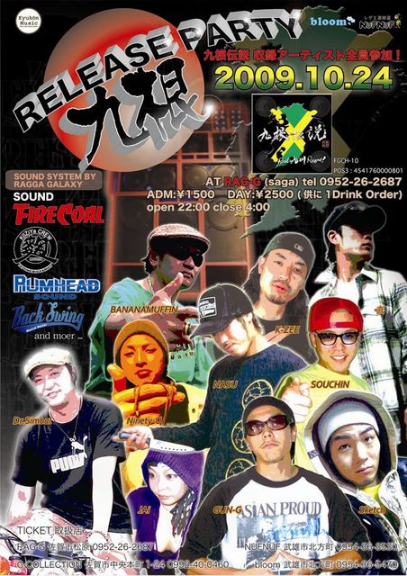 2009 全国に向けて放つ、初の九州コンピ! ■■■■■■■■■■ ―九根伝説― Real 九州 Reggae! RELEASE PARTY ■■■■■■■■■■ 2009.10.24 (SAT) 22:00 〜 4:00 @RAG-G (saga) tel 0952-26-2687 ADM:¥1500 DAY:¥2500 (供に1Drink Order) ■DEE JAY & SINGER■ BANANAMUFFIN (奄美) Dr.Simbal (福岡) GUN-G (小倉) JAi (福岡) K-ZEE (佐賀) 直 (佐賀) NASU (福岡) Ninety-U (福岡) Sketch (鹿児島) SOUCHIN (北九州) and moer… ☆マイク解放ア