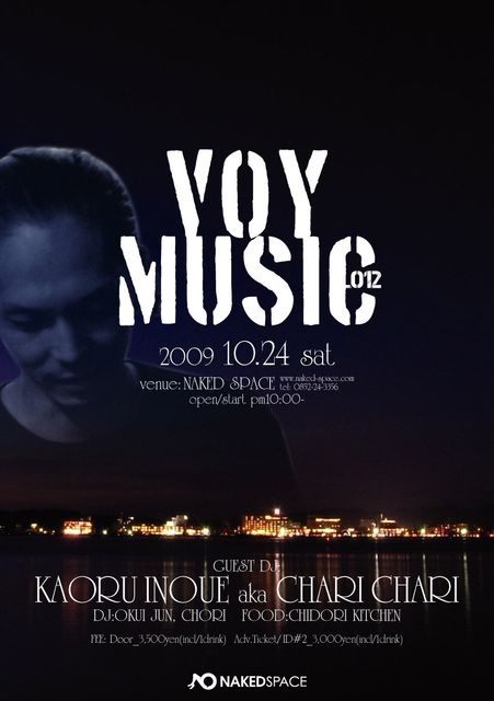 「クラブミュージック」×「遊び」をコンセプトに毎月レギュラーPARTYを重ねるVoy MUSIC! 10月のVoy MUSICはこの季節、この土地にふさわしい我らVoyの盟友KAORU INOUE aka chari chariを迎えて開催決定ー!!!ミュージックラバーすべてに捧げる夜遊び「Voy MUSIC_012」で夜長をたっぷり楽しんでください♪ 是非!! 2009.10.24.Sat 22:00〜 「 Voy MUSIC_012 」 DJ: OKUI JUN, CHORI GUEST DJ: KAORU INOUE aka chari chari http://mixi.jp/view_community.pl?id=22098 VENUE: NAKED SPACE (http://www.naked-space.com/access.html