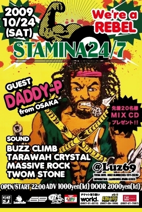 BuzzCrimb Presents ゛EVERY MONTH 4th SATURDAY REAL REGGAE DANCEHALL" 【STAMINA 24/7】 -We're REBEL- 2009.10.24(sat) @LUZ69 ADV:\1000/1d DOOR:\2000/1d OPEN/START 22:00- ■GUEST DJ DADDY-P (from OSAKA) ■REGULER SOUND BUZZ CLIMB TWOM STONE TARAWAH CRYSTAL MASSIVE ROCK &Dancer,Deejay ■RESIDENTS SOUND BUZZ CLIMB ☆2k9.6.27のSTAMINA24'7 - GOOD LIFE -でその卓越したスキルとバイブスで フロアーを驚愕の坩堝に陥れたDJ DADDY-Pがま