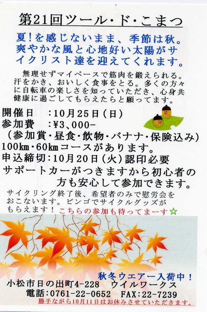 なんとなく秋めいてまいりましたね(東京の話)。 いよいよ今年もJAPAN CUPのシーズンとなってまいりました。 詳細今年も焼き直しでスミマセン。 今年もポポペク・バス (車掌竹本店長) で JAPAN CUP を観に行きます! ランプレ/リクイガス/ブイグ/クイックステップ/ワイン/餃子/森林浴。 自転車(要輪行袋収納)持込可、飲食物持込可、復路のみ可、などいろいろなパターンで! みなさんのご参加、お待ちしております! http://www.japancup.gr.jp/ (バス手配の関係上、お早めのスケジュール調整、参加表明をお願いします。