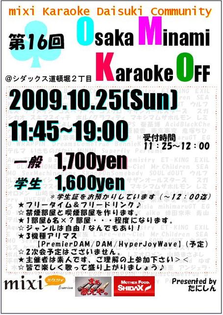 はじめまして、こんばんわ。  この度10月25日に措いて、アニソンカラオケoff会を開催、進行させて頂きます事と相成りました。 宜しくお願い致します。  自分自身二度目の幹事ですので、奈何せん不手際や気の回らない所も出て来ると思いますが、 皆でスマートに楽しむ、を目標に前準備、当日進行共々尽力させて頂きます所存であります。 宜しくお願い致します。  まず、参加に際して注意事項が数点御座います。 注意事項→http://mixi.jp/view_bbs.pl?id=43173348&comm_id=3701337 此方のトピ