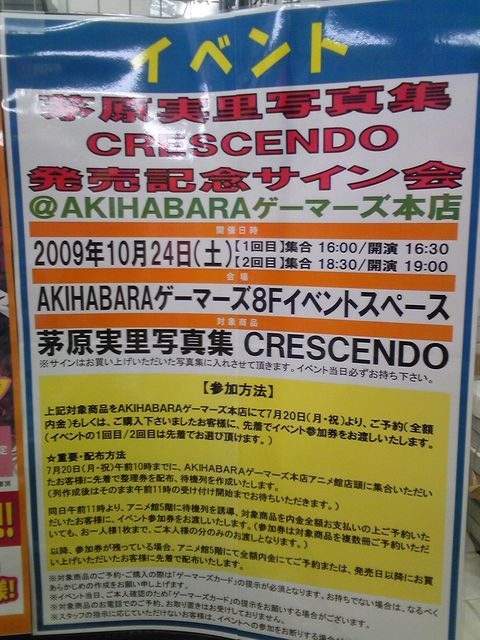 ■アニメイト秋葉原店開催 http://www.animate.co.jp/event_info/event/event_e20091024.html 【開催日】  2009年10月24日(土) 【開催場所】 アニメイト秋葉原 12:30集合/13:00開演 【出演者】  茅原実里さん 【内容】   サイン会 ■AKIHABARAゲーマーズ本店開催 http://www.anibro.jp/akihabara/index.html#event1024 【開催日時】 2009年10月24日(土)16:00開場 16:30開演 【開催場所】 AKIHABARAゲーマーズ本店 【ゲスト】  茅原実里さん 【開催内容】 サイン会 ■アニメイト名古屋店開催 http://www.animate.co.jp/e