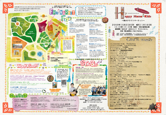 第一回 集まれ!ママ&キッズ 「秋のクラフトマーケット」 後援:羽島市・羽島市教育委員会・(社)日本助産師会岐阜県支部 コンセプト 創造性豊かな感性で、子育てをともに助け合い、楽しもう! ◆開催日時 2009年10月25日(日) 雨天時 11・1(日) 10:00〜16:00(フリーエリア) 10:00〜15:00(ステージイベント) ◆開催場所 羽島市市民の森公園 ◆入場料金 無 料 ◆出店費用 出店ブース1件につき 500円 ◆催事内容 以