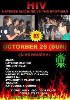 ★H×I×V★Volume.2 《BAND》 THE BROTHELS VS THE HATERED MACHINE 《GUEST-DJ》 ATSUSHI(THE valentine) 《DJ`s》 ODK&KAZUHEADS TIMOROCK METABOLIC A&兄者 NAOSHI13 (SAKURA) KATUSKE&大島 2009.10.25.SUN OPEN×START:19:00 TICKET:前\1000.当\2000(drink別+\500) @LIVE HOUSE 51