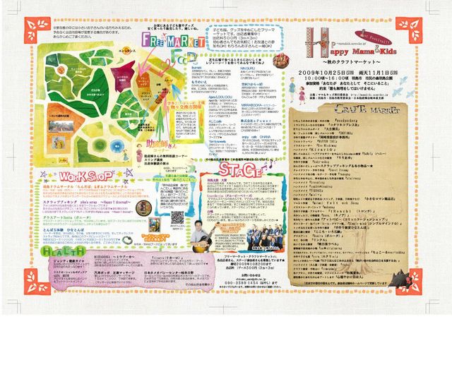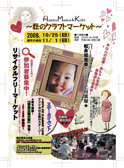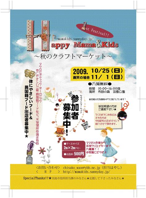 ママ&キッズ実行委員会です。 まだちょっと先ですが、10月にお祭をします。 フリーマーケット、クラフトマーケット、体に優しいフード、ホメオパシーなどの自然療法、助産師さんの無料相談コーナー、ワークショップ、ステージイベントなど盛りだくさんです。 出店含め、皆さんぜひ遊びに来てくださいね♪ 出店 1ブース 3m×3m 500円 です。 詳しくはホームページ http://mamakids,sunnyday.jp よろしくお願いいたします★