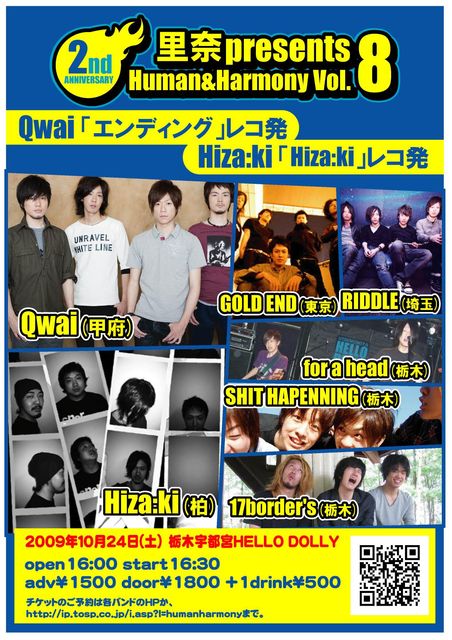 宇都宮でイベントをやっている里奈と申します!! 告知失礼します☆ 里奈企画2周年!! そしてQwai&Hiza:kiのダブルレコ発です!! イベントHP http://ip.tosp.co.jp/i.asp?I=humanharmony10 イベントのコミュニティー http://mixi.jp/view_community.pl?id=3222102 里奈presents Human&Harmony vol.8 〜里奈企画2nd Anniversary〜 Qwai「エンディング」 Hiza:ki「Hiza:ki」 ダブルレコ発!! 2009年10月24日(土) 宇都宮HELLO DOLLY open16:00 start16:30 adv\1,500 door\1,800 +1drink\500 act