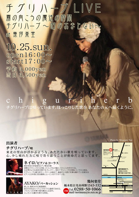 チグリハーブLIVE 霧の向こうの魔法の時間 チグリハーブ〜唄のおまじない〜 at 幾何楽堂 チグリハーブは唄っています ほっこりした歌を あなたの元へ届くように 2009/10/25(sun) open16:00/start17:00 予約3000円/当日3500円 ご予約は tel:0288-50-1066 mail:norimasa@io.ocn.ne.jp 幾何楽堂 栃木県日光市所野1543-332 出演者: チグリハーブ/唄 ネイロ/ピアノ&コーラス AYAKO/パーカッション