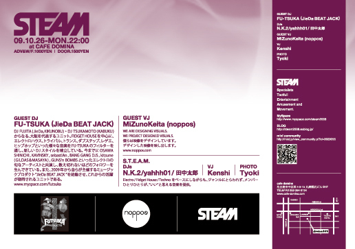 告知失礼致します。 S.T.E.A.M. 2ヶ月に1度、栄はcafe dominaにて開催されている、ひょんなことから集まった若手によるパーティー。House/Technoなど四つ打ちをベースにしながらも、ジャンルにとらわれず、メンバーひとりひとりが、"いい"と思える音楽を提供。 Myspace http://www.myspace.com/steam2008 Blog http://steam2008.exblog.jp/ mixi community http://mixi.jp/view_community.pl?id=3929055 5度目の開催となる今回は、2度目の開催でゲスト出演して頂いたJieDaデザイナーFUJITA氏のユニット"FU-TSUKA"(フツカ)を招き、さらに