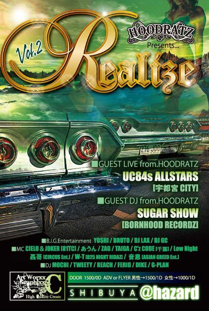 告知失礼します。 HOODRATZ Presents... REALIZE Vol.2 2009.10.26(Mon) 渋谷@hazard OPEN 22:00〜CLOSE DOOR ¥1500/0D ADV or FLYER 男性→¥1500/1D 女性→¥1000/1D <TIME TABLE> 22:00〜22:35 DJ DIKE 22:35〜23:10 DJ G-plan 23:10〜23:45 DJ FERIO 23:45〜00:25 DJ TWEETY 00:25〜01:00 SHOWCASE 1 BRUTO(7) 音恩(7) 聶哥(7) W-T(7) TAIGA(7) 01:00〜01:40 DJ LAX 01:40〜02:20 SHOWCASE 2 Low Night(10) ZAG(10) あうん(10) C'z CODE(10) 02:20〜03:00 D