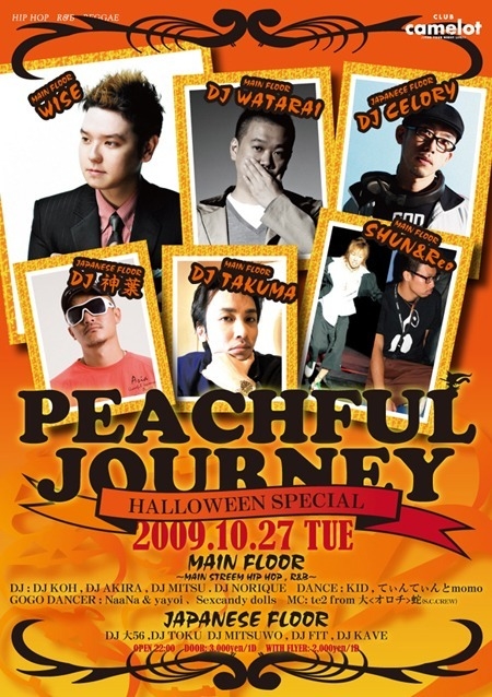 2009.10.27 TUE PEACHFUL JOURNEY @Club Camelot 〜Halloween Special〜 ■OPEN 22:00 ■DOOR: 3000/1D WITH FLYER: 2000/1D ■イベントコメント 毎月最終火曜開催!!! 9月からのNEWパーティー[ピーチフルジャーニー] 約5年にわたり進化を続けてきたPEACHFUL JOURNEYがCamelot見せるもの! 誰でも楽しめる空間を求め、CLUBミュージックはもちろん、JAPANESEフロアを設け日本楽曲のみ で、より音楽を身近に感じてもらいたい。 DJは日本のCLUBシーンを支え続けPECHFUL JOURNEYの看板DJ DJWATARAIは勿論、JAPANESEフロア には DJ C