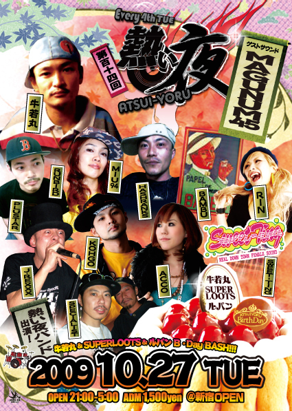 今宵はお世話になります。 牛若丸 presents!! 《熱い夜》vol.114 〜牛若丸 & SUPER LOOTS & ルパン Birthday Bash!!〜 at.新宿OPEN ◆guest sound◆ MAGNUM 45 ◆SPECIAL LIVE entertainer◆ 牛若丸 HASH RANKS MIU94 http://blog.so-net.ne.jp/blazinggirlz-bluebirds/ RUNBIRD http://m.mixi.jp/view_community.pl?id=3842932&guid=ON RIN http://m.mixi.jp/view_community.pl?id=1580396& J-REXXX http://m.mixi.jp/view_comm