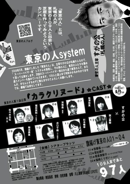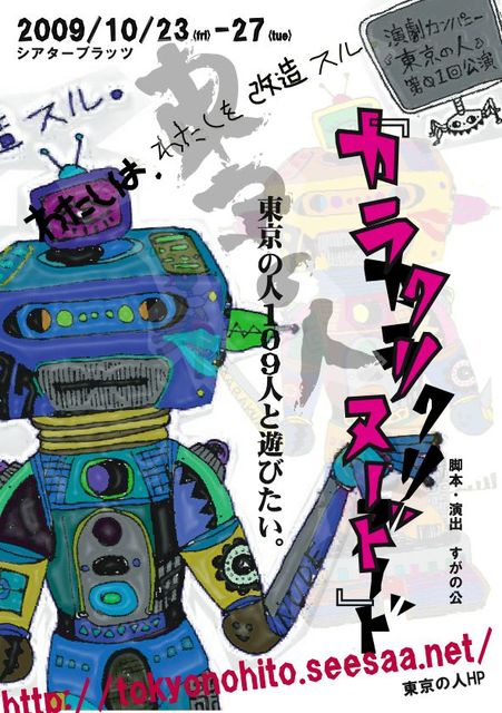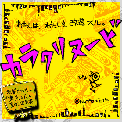 ■□■□■□■□■□■□■□■□■□ “東京の人” 第01回公演 『カラクリヌード』 〜わたしは、わたしを改造スル。〜 http://tokyonohito.seesaa.net/ ■□■□■□■□■□■□■□■□■□ 脚本・演出:すがの公 <出演> 佐々木光弘(猫☆魂) 芳賀晶(熱帯) 福田英和(7の椅子) 秋澤弥里 菊池美里 井口千穂(7の椅子) 杉木隆幸 阪上善樹 すがの公(ハムプロジェクト) <会場>シアターブラッツ(新宿区新宿1−34−16 清水ビルB1) <公演日程> 10/23(金) ☆