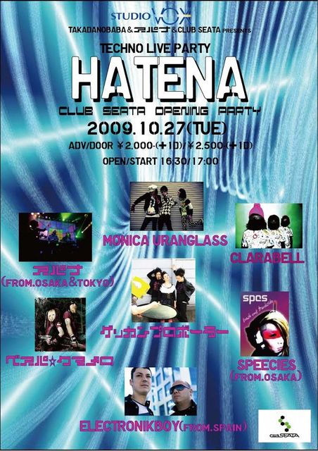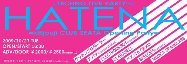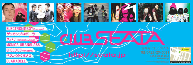 くまメロ、初めての平日ライブ!! 大阪のスパナの皆さんに誘って頂きました。 吉祥寺に今月オープンしたばかりのCLUB SEATAで開催される超豪華イベントです。 平日ですが是非!仕事なんか1日休んで是非!(笑) 2009/10/27(Tue) @ 吉祥寺CLUB SEATA http://seata.jp/artist.html 『HATENA 〜CLUB SEATA OPENING PARTY〜』 ADV/DOOR ¥2,000-(+1D)/¥2,500-(+1D) OPEN/START 16:30/17:00 ▼Live Act... ●スパナ(from.osaka&tokyo) http://www.myspace.com/spannerjapan ●ELECTRONIKBOY(from.spain) http://www.electronikboy.c
