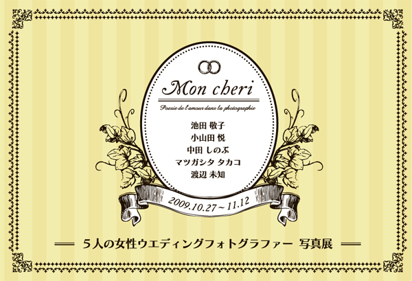 先月神戸にて北浜バーガーで大暴れしてきたジョカーレですが まだまだ面白いイベントは続きます 今回はしっとりと芸術の秋っぽく 写真に興味のある方や特に女性のお客様には嬉しいイベント開催です 〜Mon cheri〜 5人のウェディングフォトグラファーによるフォトグループ展 日時:10/27-11/12(営業時間内) にて写真展を開催します http://www.giocare.jp/ フォトグラファー5人いてそれぞれ個性があるので色々と批評してみてください 出展してくれる5人のフォトグラファーは 池田 敬子 http://2kiki.com/ 小山田 悦