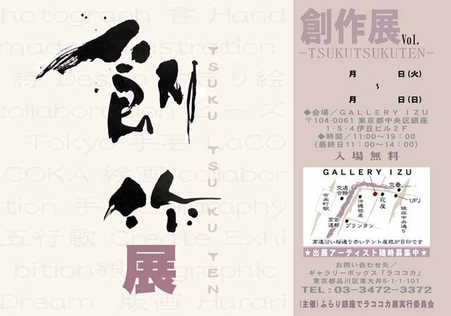 ちょっぴりおしゃれな銀座桜通り沿いのギャラリーにて… *ラココカお楽しみイベント* 創作展(TSUKUTSUKUTEN)? 「ふらり銀座でラココカ展」 <2009年10月開催 グループアート展> おかげさまで9回目の開催を迎えます… 今回は、主催者(私)の予定決定等準備不足にも関わらず、ご参加して下さるアーティスト様方と、 グループアート展 「創作展(TSUKUTSUKUTEN)」を開催する運びとなりました。 ただただ。 感謝!感謝! 感謝! です この度も。 どうぞ、よろしくお願い致します テーマは「フ