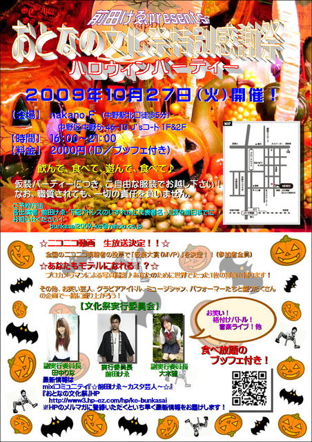 前田けゑpresents『おとなの文化祭』特別感謝祭☆ハロウィンパーティー 【会場】 nakano F (中野駅北口徒歩5分) 中野区中野5−46−10 J’sコート1F&2F 【時間】 16:00〜21:00 【料金】 2000円(1D&ブッフェ付き) 10月は、前田けゑが日頃の感謝を込めてパーティを開催します どなたでも参加OK!! ハロウィンなんで、ご自由に仮装してお越しください アニメコスもよし、メイドもよし、なんでもOK そしてなんとニコニコ動画生放送しちゃいます
