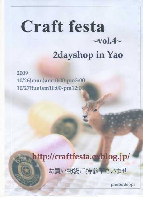 こんにちはみなさま。 そろそろ季節も秋にと移行してきましたね。 ハンドメイダーにとって一番うれしい季節ではないでしょうか? 第四回クラフトフェスタ開催いたします。 ******************** ■Craft festa vol.4 http://craftfesta.exblog.jp/ ■2009年・・・雨天決行。 10月26日(月) am10:00-pm15:00 10月27日(火) am10:00-pm12:00 *時間が不規則となっております。 お間違いのないようお願いします。 ■大阪府八尾市本町2丁目13−9 ビ