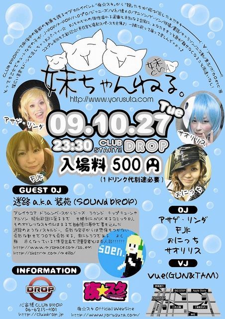 わぁぁぁぁぁい 初めての妹だけのイベントだぉー!!!!!! ヤバイよぉぉぉぉぉwww もちろんゎたしたちコスプレします ワンコインで入れるのでお気軽にぉ越しくださいませ(ドリンク別途) 『夜☆スタ』から【妹】たちが飛び出したぁ〜!!キタ━━━━(゜∀゜)━━━━!! と〜っても乙女でキュートな女の子が、J-POP/A-POP/ハロプロ/ジャニーズ/V系/懐メロ/アニソン/ゲーソン/特撮/童謡/キャラソン/ニコ動/東方/ボカロetc‥等々幅広い音楽をドーンと流しちゃぅDJパーティー♪ DJそれぞれの個性溢