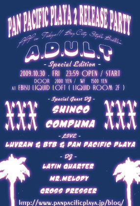 ハマのアーバン&メロウ集団=PAN PACIFIC PLAYAが、2007年のファースト・コンピに続き、セカンド・コンピをリリース!!!(ともに傑作すよ!)明晩は、そのリリース・パーティーになります。ゲストDJには、スチャダラパーさんよりSHINCOさん、スマーフ男組さんよりコンピューマさんをお招きして、よりアーバンでメロウなベイ・シティ・スタイリンでおおくり致します。