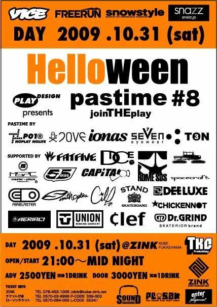今年もやってきます。 そうです。HELLOWEEN!にPASTIME! 交流会も開催予定ですが、とりあえずはスケジュールの確保よろしくおねがいしまーす! ____________________________________________________________________ どうも大変遅くなりすいませんでした〜! まずエントランススノラバプライスは ☆2000円(ワンドリンク付き)☆ 1500円別途500円です。宜しくお願いいたします。 シーズン直前の恒例イベント PLAYDESIGN presents『Hello ween pastime#8 joinTHEplay 』開催のお知らせ♪ “P01”や“7OV