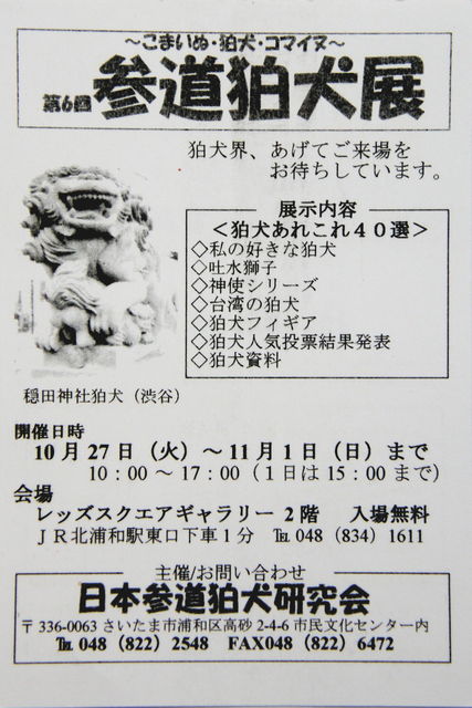 第六回参道狛犬展 開催日時 10/27(火)〜11/1(日) 10:00〜17:00 11/1は15:00で終了 会場 レッズスクエアギャラリー 2階 入場無料 JR北浦和駅東口下車1分 Tel(048)834-1611 さいたま市浦和区北浦和3-1-1 ここでやんす。 http://www15.plala.or.jp/timebox/top/6komaten.html ---------------- 毎月突発だと大変なので、気の長〜いイベント準備トピを立てます。 出展です! メジャーデビューです。 内容はきまってませんが、ステンドグラスと、切り絵は、