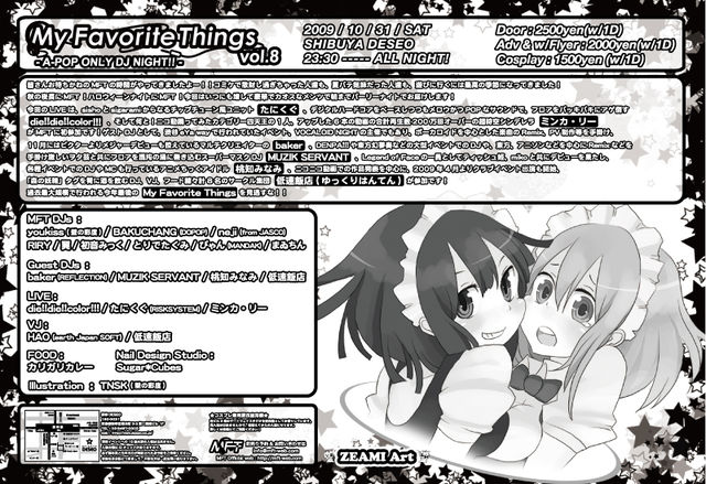 皆さんお待ちかねのMFTの時間がやってきましたよー!! コミケで散財し過ぎちゃった人達も、夏バテ気味だった人達も、遊びに行くには最高の季節になってきました!秋の夜長にMFT!ハロウィーンナイトにMFT! 今回はいつにも増して豪華でカオスなメンツで朝までパーリーナイトでお届けします! 今回のLIVEは、sishoとsigaramiからなるチップチューン風ユニット「たにくぐ」が、デジタルハードコアをベースしつつもメロウかつPOPなサウンドで、フロアをバッキバキにアゲ倒す「die!!die!!color!!!」、 そして何と!ニコ動踊ってみたカテゴリー四
