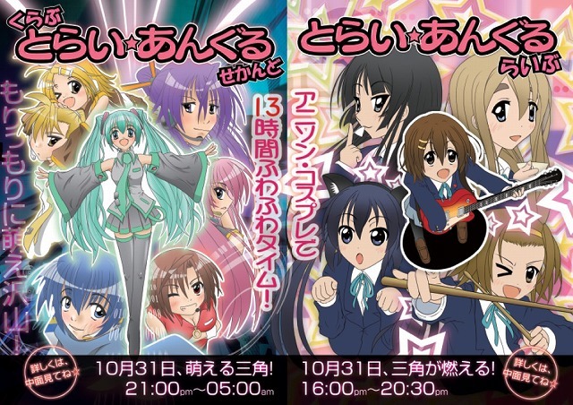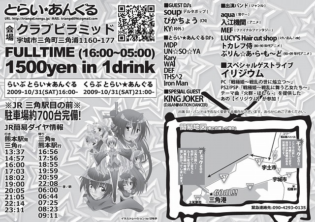ついにキタキタ! とらい★あんぐる せかんど! 今度のとらい★あんぐるはクラブだけじゃない! バンドのライブイベントも一緒にやっちゃいます! 熊本いや九州ではたぶん初開催と思われる13時間の連続イベント! コスプレはもちろん可能!今度は夕方からだから野外でいい写真が撮れるかも! 痛車の方もどんどん来てください!台数が多かったら展示スペース作ります! アニソン・コスプレで13時間ふわふわタイム! 10/31 16:00 〜 11/01 05:00 FULL TIME 1,500円@1D付 クラブピラミッド@熊本県宇城市三角町三角浦1160-177