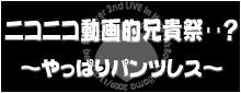 ライヴ開催に伴い、イベントトピをたてました。 一人で参加だけど、誰か一緒にいきませんか?などこちらに書き込みOKです(*^▽^*) 参戦者交流の場としてどんどん使ってください♪ ライブ概要 ニコニコ動画兄貴祭り・・? 〜やっぱりパンツレス〜 【Live】さいたま新都心Heaven's Rock【告知】 http://www.nicovideo.jp/watch/sm8550483 特設HP: http://egamyer.net/nc/htdocs/ 日時: 2009年11月22日(日) open 14:45 / start 15:30 会場: HEVEN'S ROCK さいたま新都心 〒338
