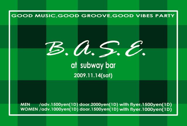 11/14(SAT) 22:00〜END GOOD MUSIC,GOOD GROOVE,GOOD VIBES PARTY!! B.A.S.E@SUBWAY DJ:TOMO/PH@T/HIKARU/UGEE/A-SYAN/BIBI/OKU/P.I.G TICKET MEN-ADV:\1500(1D)/DOOR:\1000(1D) WOMEN-ADV:\1000(1D)/DOOR:\500(1D) SUBWAY奇数月第二土曜日の看板PARTY!! B.A.S.E!! 毎回HIPHOP/R&B/REGGAE/HOUSEを中心に 次から次へと繰り出されるGOOD MUSIC!! 振る舞いシャンパンにて煽るGOOD VIBES!! 遊びに来たみんなで作られるGOOD GROOVE!! 毎回狂気乱舞なB.A.S.Eぜひぜひ遊びにきてください! 前回の様子は http:/