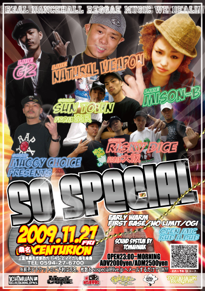 告知失礼します。 12月28日に京都にて東海代表としてクラッシュへの参戦が決定しているMAGGY CHOICEが'09最後の主催ダンス!! 今回は豪華に3ARTIST&2SOUNDを招いてのSO SPECIALです!! ゲストアーティストは レペゼン泉州のGHETTO PRINCE "NATURAL WEAPON"!! 男社会のレゲエ界で勝ち抜く女DJ "MISON-B" 東京のDJクラッシュでの優勝も記憶に新しい、レペゼン岐阜の"G2" サウンドは 奈良から活きのいい若手の中でも一際、異彩を放つSOUND "SUN TOWN" NYと大阪から世界を揺らすDEADLY SOUND "RISKY DICE" 11/27(金) "SO