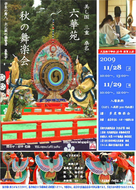 多度雅楽会(http://www.tadogagaku.com/)の舞楽会 です。 今年も宮本卯ノ助商店の大太鼓を借りて 野外の舞楽会が行われます。 < 桑名 六華苑 秋の舞楽会 > 芸術文化振興基金(文化庁)等助成事業 日時 : 11月28日(土) 10:00〜 13:00〜 29日(日) 10:00〜 12:00〜 天皇陛下即位20年祝賀上演 萬歳楽、延喜楽、陵王・納曽利・散手・貴徳・迦陵頻ほか 無料ですが、六華苑の入苑料300円が必要。