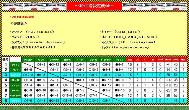 最初に!参加の際、ウイイレ専用IDの記載がない場合、 参加と見なしません。 また、今大会は大会形式や、試合結果報告方法が今までの大会と 異なりますので、必ず規定を確認の上、参加表明お願いします。 相手にも迷惑がかかる為、全消化確実に消化出来る方のみご参加ください。できそうもない方は、参加をご遠慮願います。 第16回〜第20回大会及びロビー管理チーム主催大会で、歴代大会上位者表彰トピにて 表彰された方限定による、コミュ王者決定戦4th[PS3版]を開催致します コミュ最強をかけた戦い・・・今大会で、コミュランキング