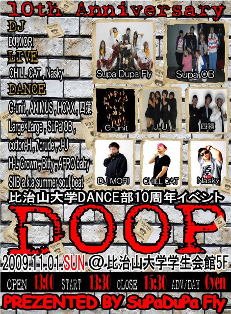 比治山大学DANCE部 SuPa DuPa Fly PREZENTS 【DOOP vol.10】 @比治山大学学生会館5F DAY/2009.11.01.SUN ADV/DAY 0yen OPEN/13:00/START/13:30/CLOSE/15:30 【GUEST DJ】 DJ MORI 【GUEST LIVE】 CHILL CAT , Nasky 【DANCE ACT】 SuPa DuPa Fly OB ANIMUS G-unit 四猿 7crude Large×Large HOAX AFRO baby J-U cotton-H Bitty H-L Crown S�B a.k.a summer soul beat 【GUEST】 *DJ MORI 2003年よりDJを始め、数々の国内アーティストと共演を果たす、