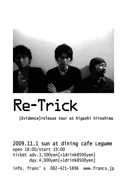管理人様 失礼します。ライブ告知をさせてください! 今年早くも2度目となる Re-Trick の西条ライブ決定です! Re-Trick [Evidence]release tour at higashi hiroshima 2009.11.1 sun. at dining cafe Legume open 18:00 / start 19:00 ticket adv. \3,500(+1drink @\500) door. \4,000(+1drink @\500) ticket info. franc's 082-421-5896 E-Mail:francs@circus.ocn.ne.jp http://www.francs.jp dining cafe Legume 東広島市三永3丁目17-25 ペットケアアパートメントLA TERRASSE