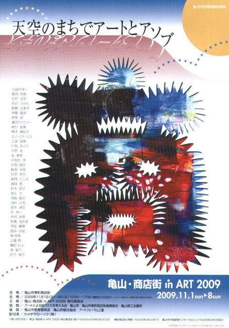11月1日は亀山商店街 in ART2009が開催されます。 タイトルは”天空のまちでアートとアソブ” 11月1日(日)は東町の通りがホコテンになります。 路上で10m四方の絵画作成 アフリカ音楽のライブ 路上にチョークで落書き 缶バッジ製作もできます。 詳しくはチラシを http://shimin-kyodo.sakura.ne.jp/kirakame21/art/tirasi.html