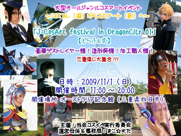 J-CosArt festival in DragonCity 01 通称「どらふぇす」 実行委員に参加させて頂いております(^^)v 11/1 四日市オーストラリア記念館にて開催!! URL:http://dorafes.uijin.com/ E-mail:dorafes777@gmail.com 主催:東海コスイベ実行委員会 運営母体&事務局 まこ☆すた『(有)地球デザイン JOO事業部』 参加費/コスプレイヤー・カメラマン:1名2,000円(事前登録で1700円) 完全登録制です。それは『名刺』1枚を必ず提出して頂く事が条件です。 手書きでも構いません。お名前とメールアドレスなどご記入されてい