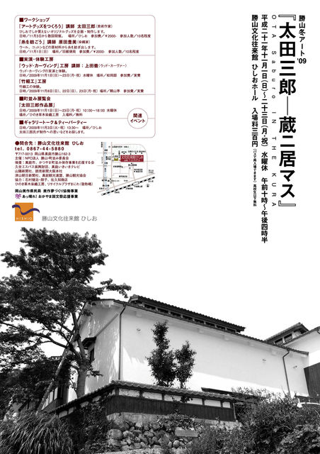 勝山冬アート’09というイベントで、糸紡ぎのワークショップをします。 ウールやコットンなど、いろいろな素材を糸車やつむぎゴマで、 クルクルと糸にします。どこにもない面白い糸づくりをめざします。 初めての方、子どもさんでも大丈夫です。 11月1日(日)午前の部 午前10時から 午後の部13時から 講 師 原田豊美(アーツ&クラフツビレッジ) 場 所 勝山 旧郵便局跡 参加費2,000円 申し込みは ひしお事務局へ 0867-44-5880 当日は、勝山紅葉祭りもあり、にぎやかです。また、醤油蔵を改装