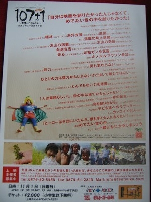 11月1日の日曜日に以前、スカイジョーカーにも来てもらったことがある 「てんつくマン」とその熱き仲間達がつくったドキュメンタリー映画が 全国一斉上映されることになり当店で上映さしてもらえることになりましたぁ♪ お見逃しなくです。*'∀'* *日時 11月1日(日曜日) *OPEN 12:30 *START 13:00 (18:00イベント終了予定) *チケット ¥2,000・・・上映チケット&ワンドリンク付(小学生以下無料) *場所 SKY↑JOKER 彦根市戸賀町143Can's夢工場Part1 2F *電話