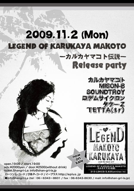 告知失礼いたします。 ********************************* 2009年11月2日(月)祝前日 LEGEND OF KARUKAYA MAKOTO -カルカヤマコト伝説- リリースパーティー 出演... カルカヤマコト MISON-B SOUNDTROY ロデムサイクロン タク-Z TETTA(tr) open/start:19:00 adv.\2,000/door.\2,500(without drink) ticket.Shangri-La:info@shan-gri-la.jp ローソンL−コード/ぴあP−コード/イープラス http://eplus.jp info Shangri-La (tel:06-6343-8601/fax:06-6343-8630/mail:info@shan-gri-la.jp