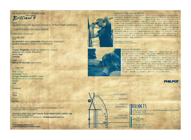 ■MONDAY.02.NOVEMBER.2009 Brilliant* feat. Soulphiction with Suzana Rozkosny (Philpot from Germany) @CLUB ROCKETS+SAOMAI,OSAKA 06-6649-3919 Address 6025 NAMBA-PIER 2-11-1 Nambanaka Naniwa-ku,Osaka OPEN-22:00〜CLOSE-8:00 -ROCKETS SIDE- ●LIVE Soulphiction a.k.a. Jackmate (Philpot from Germany) Suzana Rozkosny (Philpot from Germany) ●DJ Yusaku Shigeyasu (Torema, Radial from Tokyo) Kazuma (Mo’wave, Stillecho), Kunio Asai tsukasa ●LASER Sence Of Wonder (Spectr