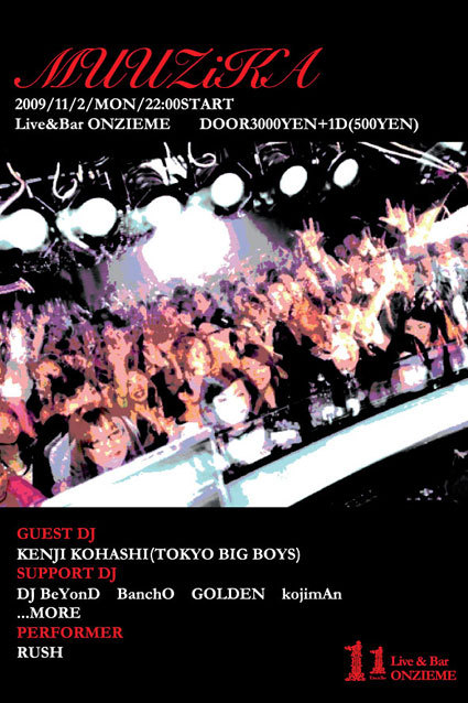 日時:11月2日 22時スタート イベント名:MUUZiKA 料金:3000円+1D(500円) クラブ:Onzieme MUUZiKA 1996年より東京で産声をあげたパーティー"CELL"が2009年より関西地域を拠点にNEW パーティー"MUUZiKA"をスタート。 エレクトロ&テクノをベースとしたジャンルでクラブピープルから、コアなクラウ ドまでをうならせる!! 毎回様々なアーティストやモデルも参加し話題を呼び華やかな一夜を演出します !! GUEST DJ KENJI KOHASHI (TOKYO BIG BOYS) DJ BeYonD[AL project] GOLDEN(blume*) kojimAn BanchO 読モD