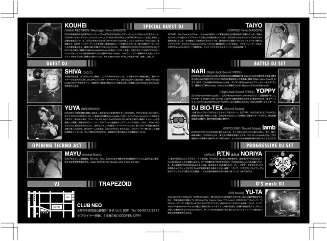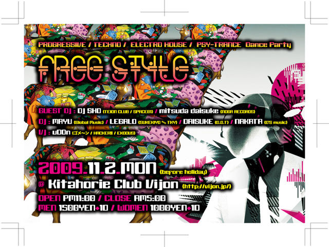-PROGRESSIVE / TECHNO / ELECTRO HOUSE / PSY-TRANCE DanceParty- 『FREE STYLE』 GUEST陣は、TEIONCLUB で活躍している 『DJ SHO』!! http://www.teionclub.com/ そして、Full-on PSY-TRANCE dj 1000DREAM の エレクトロ名義、『ミツダ ダイスケ』 をメインとした、ラインナップにて、お洒落かつ、最高の音質、北堀江@VIJONをお楽しみに! ■ 開催日時/2009/11/2/月曜 (祝前日) ■ 場所/北堀江 club vijon ■ OPEN/23:00 CLOSE/5:00 ■ DOOR MEN /1500yen+1D WOMEN /1000yen+1D 【 MAIN GUE